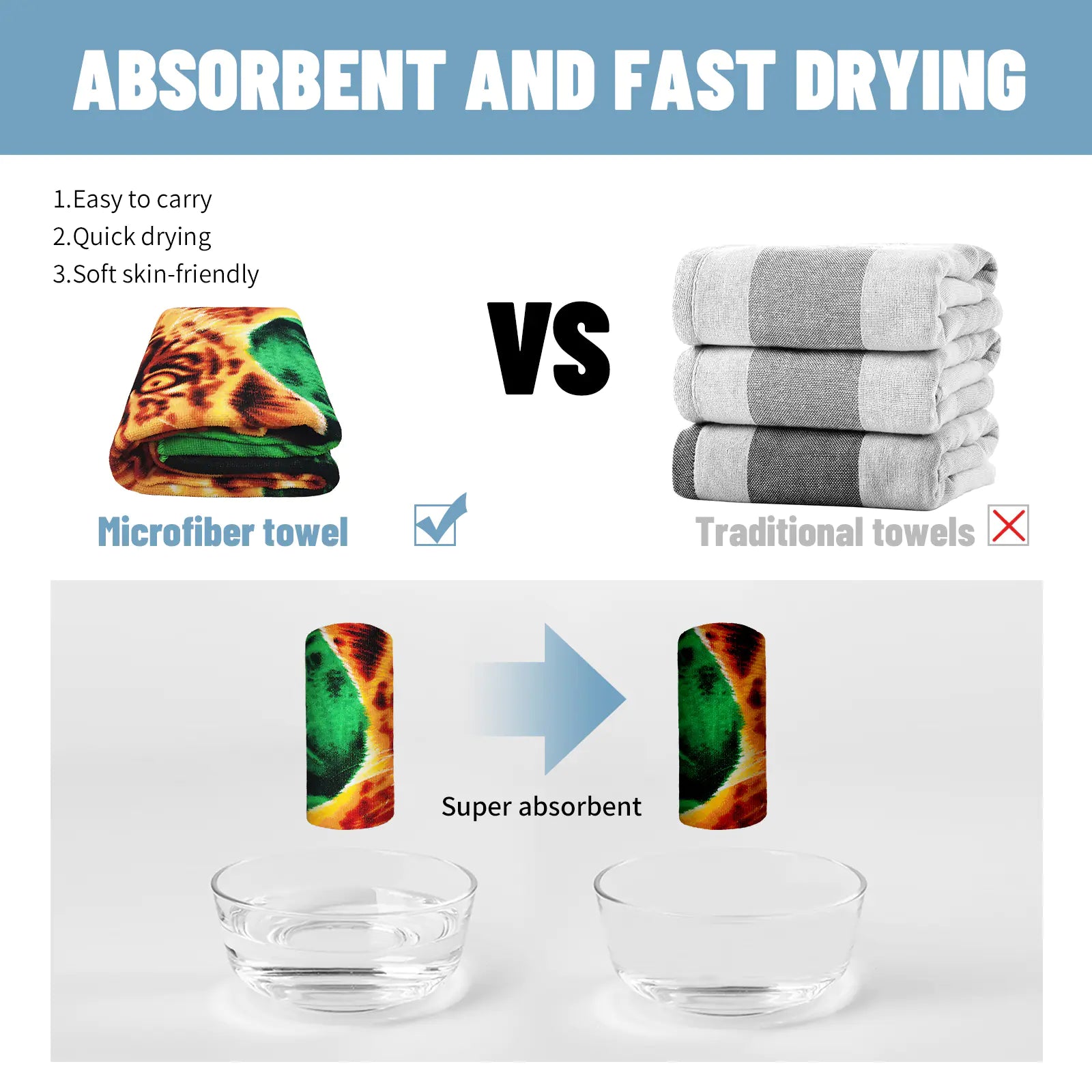 The vibrant green design featuring striking tiger and leopard prints adds a touch of wildness to your relaxation routine. Stand out at the beach or poolside with this unique and eye-catching towel.