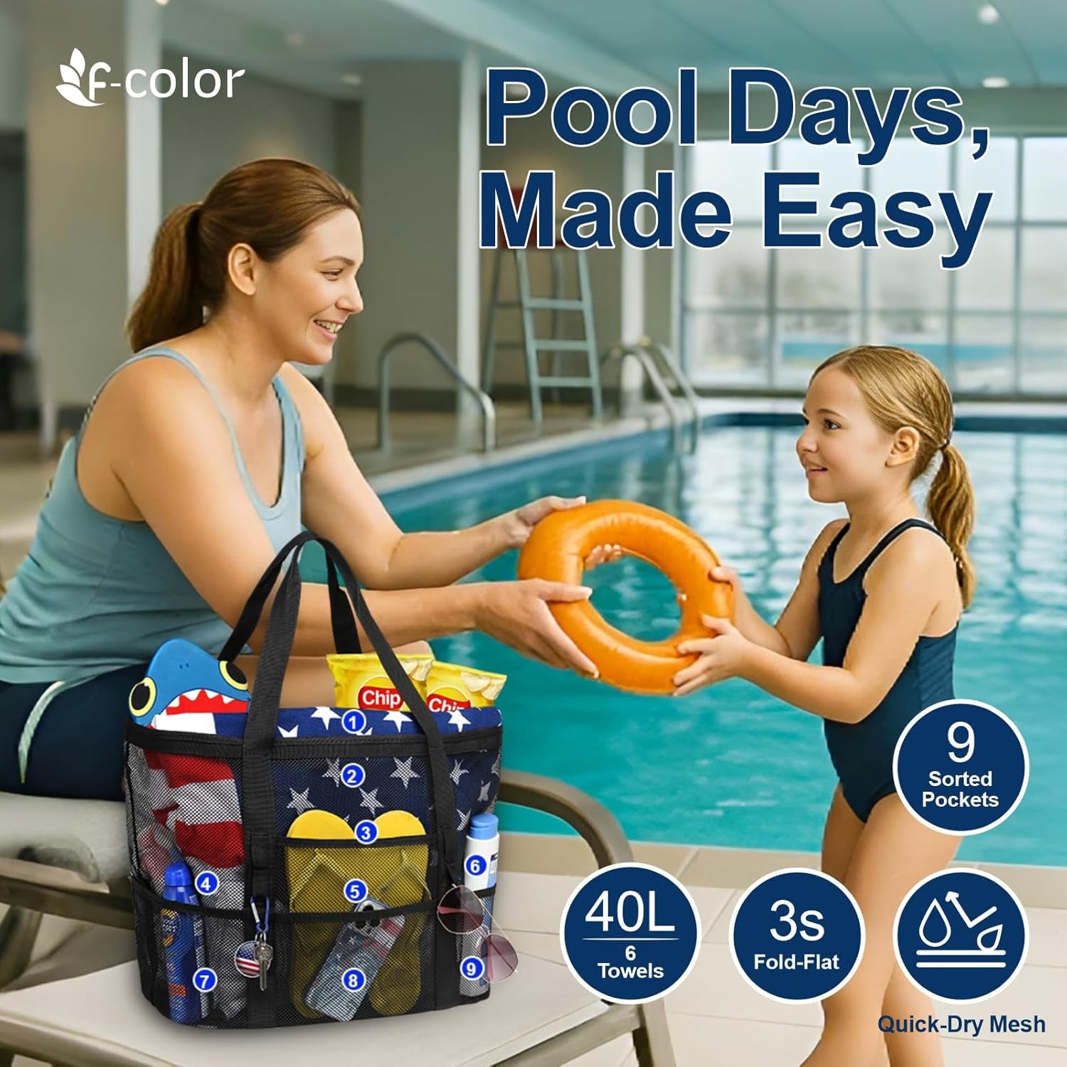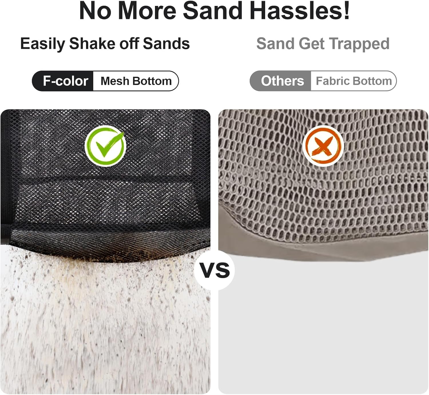 F-color Mesh Beach Bags for womenPlanning a Beach Trips, family vocation activities, travels, cruise, swim, pool, camping and grocery shopping?This large beach bag is your answerBuying this mesh beach tote now, and you can enjoy the good time. Why not try?1.Cleverly crafted with 8 big mesh pockets and 1 inside zipper pockets: large enough for you to leave your stuff packed and ready to go. Many pockets can keep your stuff separated and organized.2.This beach bag and tote is perfect for all your outdoors adventures that require carrying lots of items such as towels, swimming accessories, beach books, picnic snacks, water bottles, sunblock, shoes, sunglasses and more.3. 1 inside zipper pocket: the zipper pocket can keep your item private, safe and dry.4. Sturdy mesh material: the mesh is easy to clean, dry! The mesh is 3mm x 3mm, so the sand get trapped anywhere! 5. Four Clever Rings in front of the large beach bag can hang your keys, bottle, cap, easily locate them at the end of the day.6.Light weight and foldable: The beach tote bag for women is less than 1 lb. weight for easy carrying. And the beach bag can be folded up for storage, space-saving when traveling.