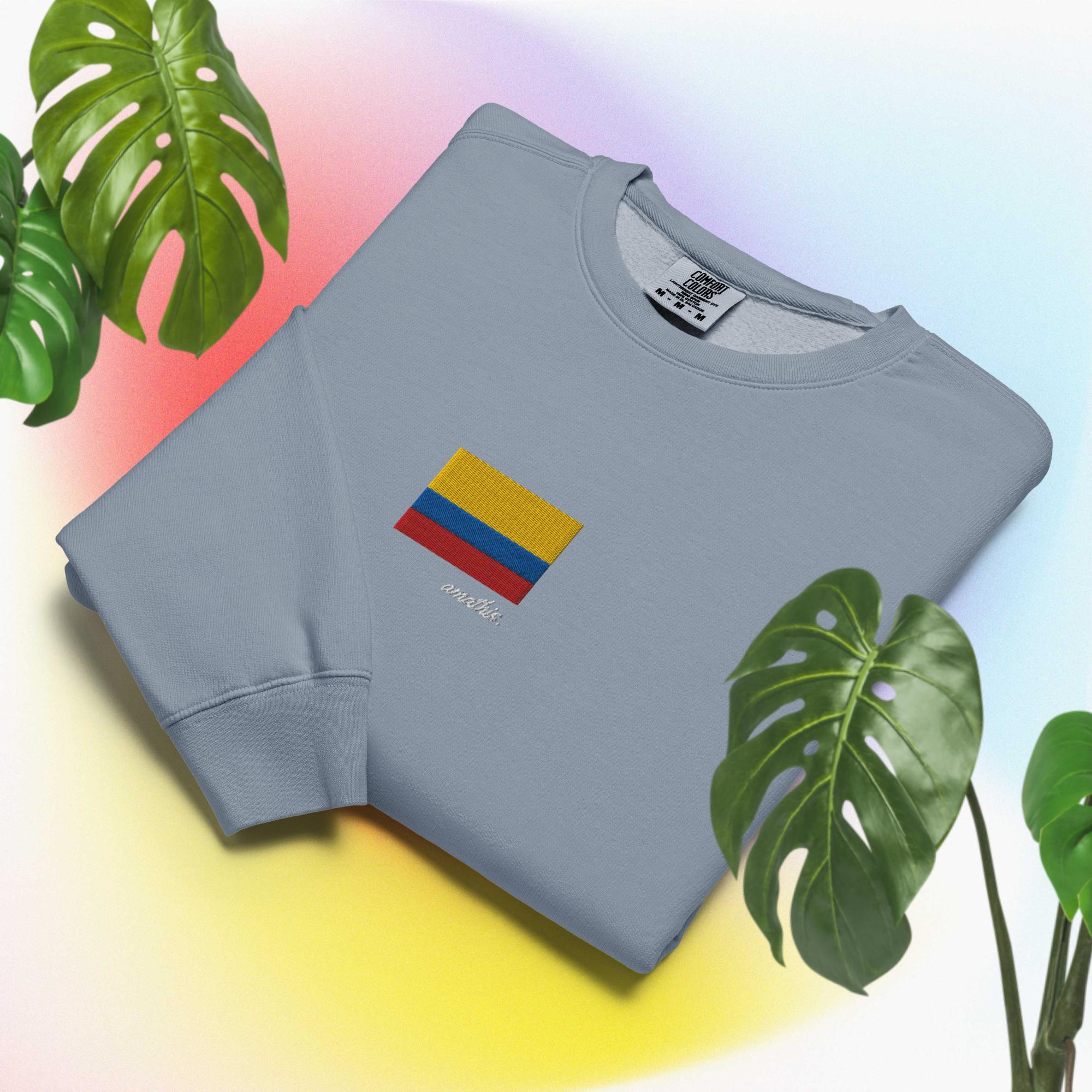 Show your pride in comfort and style with the AMATHIS Colombia Sweatshirt. This garment-dyed crewneck offers a relaxed vintage look and premium fleece softness. Each piece is pre-washed for a unique, lived-in feel — no two are exactly alike.